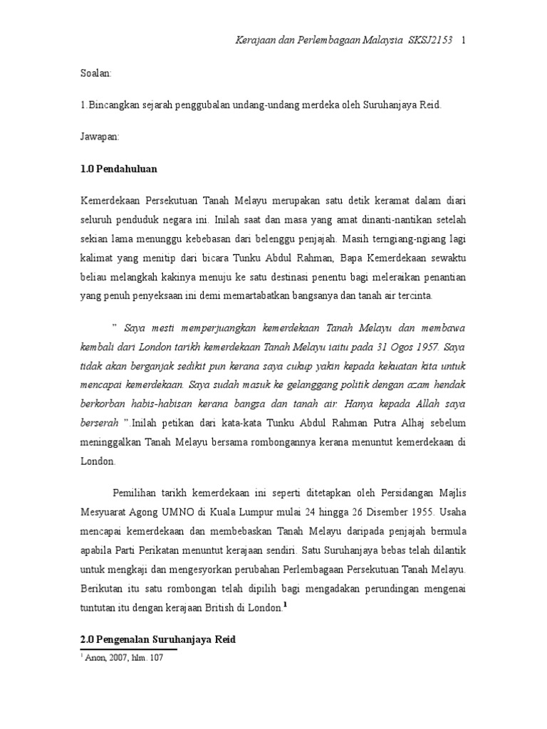 111, heeren street, melaka pada 17 ogos 1956. Suruhanjaya reid telah mengadakan referendum dalam kalangan penduduk tanah melayu termasuk orang awam ,parti politik,badan awam ,dan cadangan suruhanjaya reid menurut laporan suruhanjaya reid, kerajaan persekutuan tanah melayu yang merdeka akan diketuai seorang raja. · suruhanjaya ini ditugaskan untuk membincangkan dan menyusun. Bertanggungjawab menggubal perlembagaan persekutuan tanah melayu (ptm) • membincangkan & menyusun perlembagaaan ptm yg merdeka.